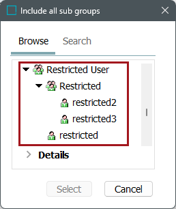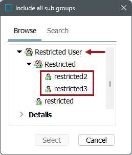 In the example below, checking the Include all sub groups option and selecting the Restricted User group, this would include the 'restricted' user, as well as 'restricted2' and 'restricted3.'