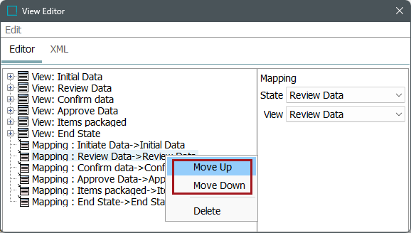 Sequence the mappings in the appropriate order by right-clicking on a mapping and selecting 'Move Up' or 'Move down' to define the order in which the views are presented to the user on the STEP Workflow navigator tab. Mapping sequence is typically assigned alphabetically or sequentially (e.g., the first state in the workflow is sequenced first).