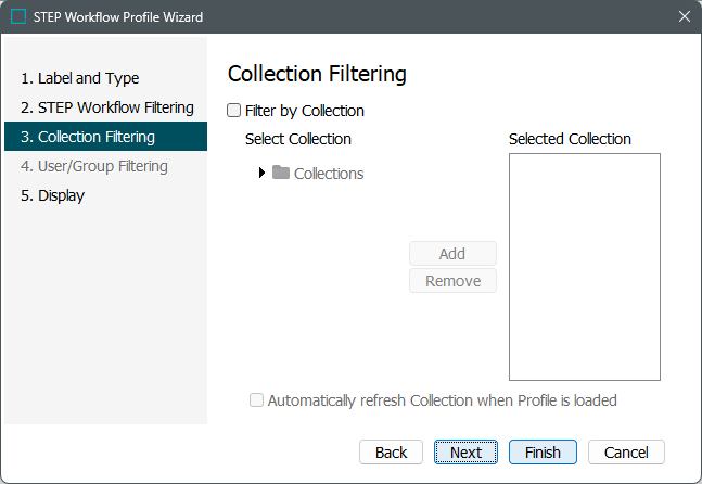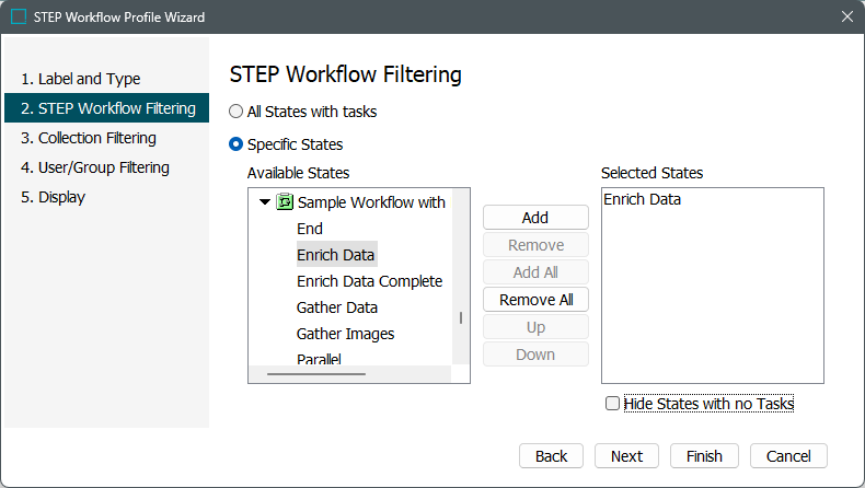 For STEP Workflow Filtering, determine the workflows or workflow states (within one or multiple workflows) that the profile should contain as defined below.
