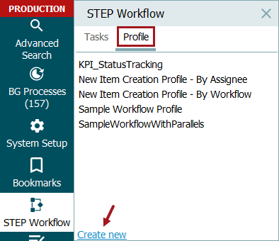 To create a new Profile, navigate to the STEP Workflow tab, select the Profile sub-tab, and click the Create new link at the bottom of the Profile sub-tab.