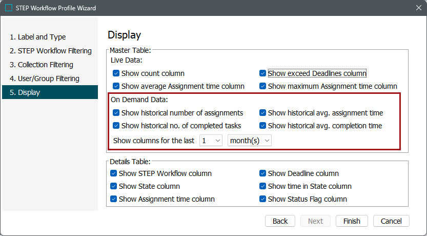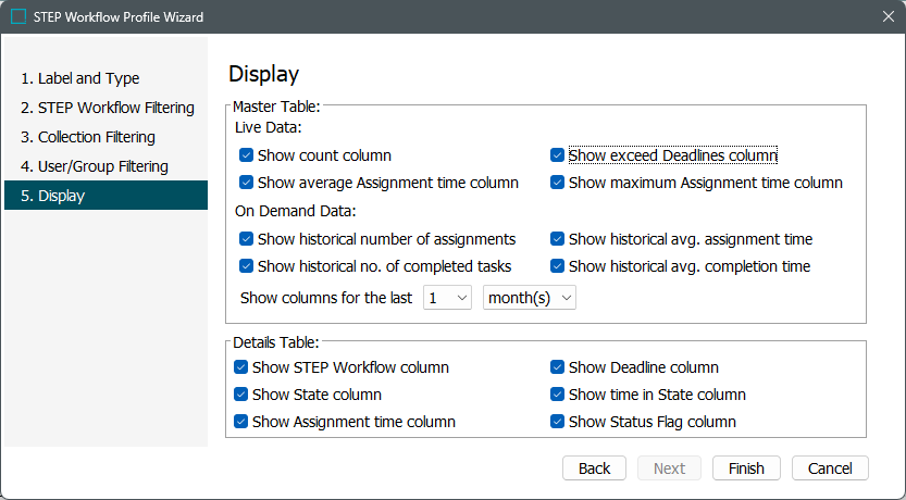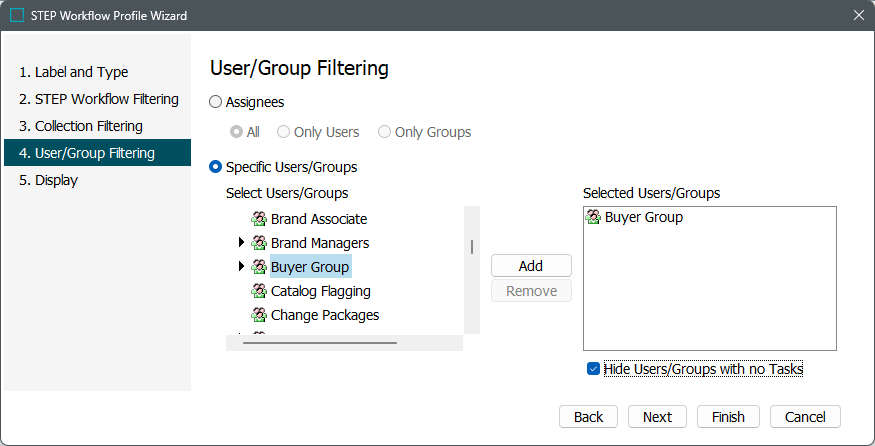 For User / Group Filtering, a user can filter the profile results to contain information only for tasks that are assigned to specific users or user groups. This step is disabled for the STEP Workflows domain.