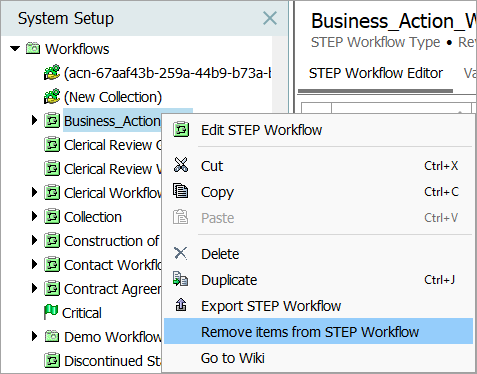 Navigate to System Setup, right-click on the workflow that needs all items removed, and select Remove items from STEP Workflow.