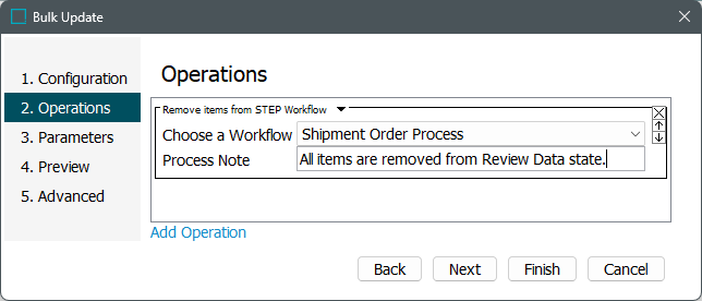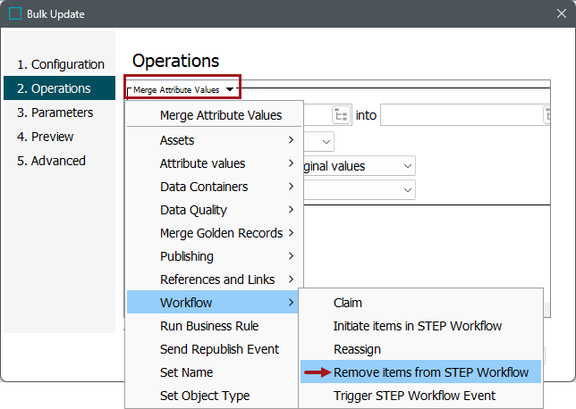 - Click Next and on the Operations step, from the dropdown menu select Workflow > Remove items from STEP Workflow.