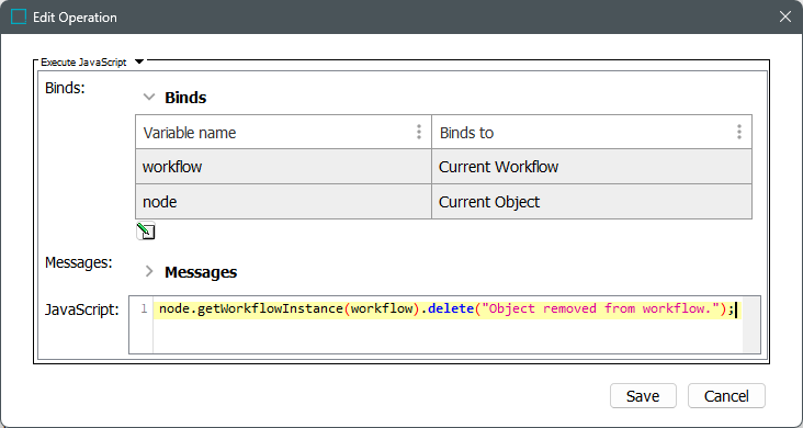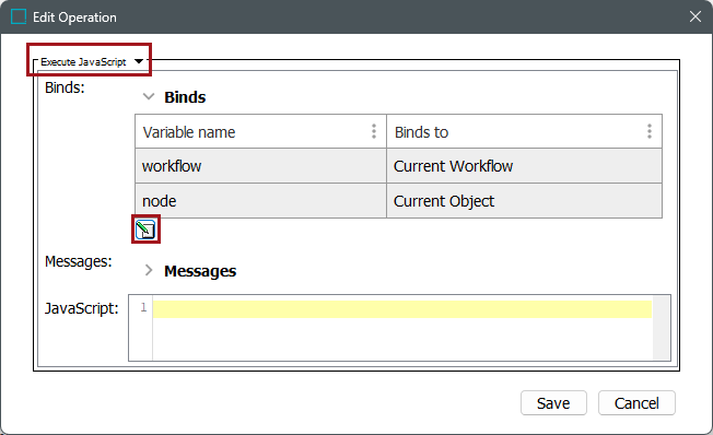 - Select 'Execute JavaScript' from the dropdown menu, and click on the Edit Binds button to add any necessary binds. The two variables and binds for this example workflow are: 'workflow' to Current Workflow and 'node' to Current Object.