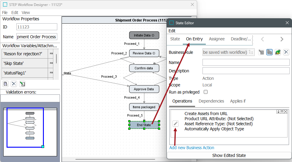 - In the State Editor dialog, select the On Entry tab and click the 'Add new Business Action' link.