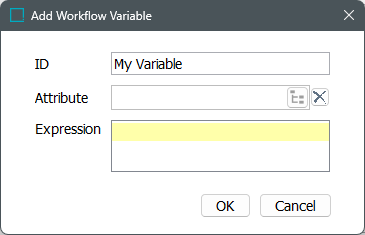 In the Add Workflow Variable dialog, enter the ID of the variable, optionally select an 'Attribute' to bind it to or add an 'Expression'.