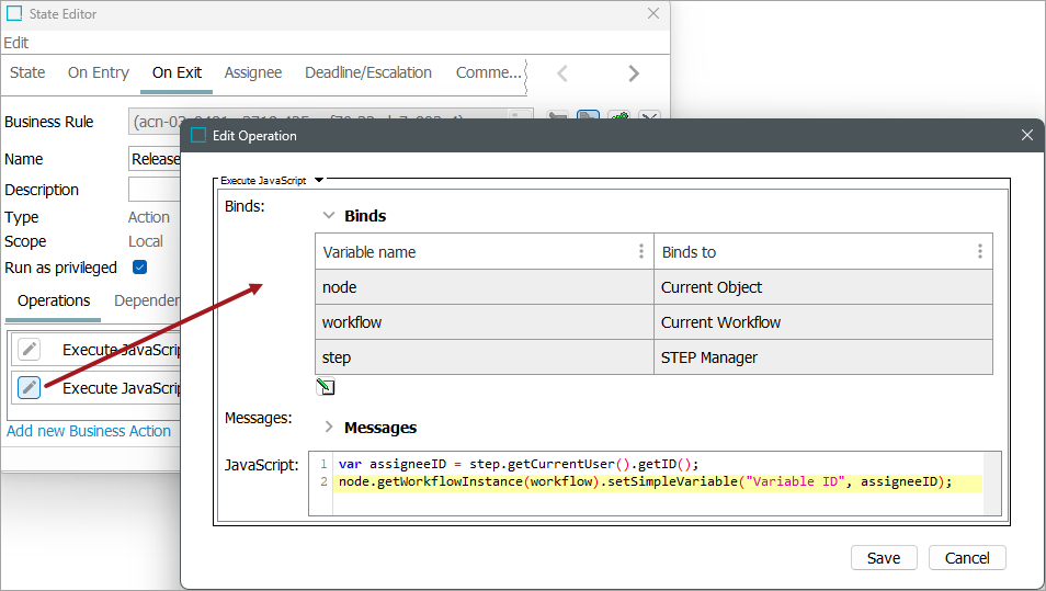 JavaScript Variables - Standard JavaScript variables can be declared in business actions and conditions. The scope of these variables is limited to the action / condition where they are declared and are only persisted during the execution of the action / condition.