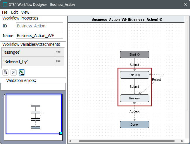 A bound workflow variable is tied to a STEP Attribute and gets its validation from the STEP Attribute. The description attribute must be externally maintained, non-dimension dependent, and must not be valid for any object type. Additionally, bound workflow variables have access to the corresponding attribute editor when a user chooses to display them in the workbench views (refer to the Views and Mappings for Workflows topic).