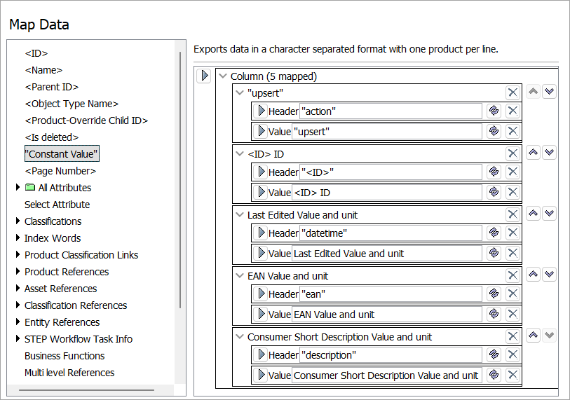Below is an example of an 'upsert' action in the Map Data step for the external database table shown above. This setup will direct the process to look for four configured attributes (ID, DATETIME, EAN, and Consumer Short Description) in the destination database table, and either insert the object (if not found), or update the object (if found):