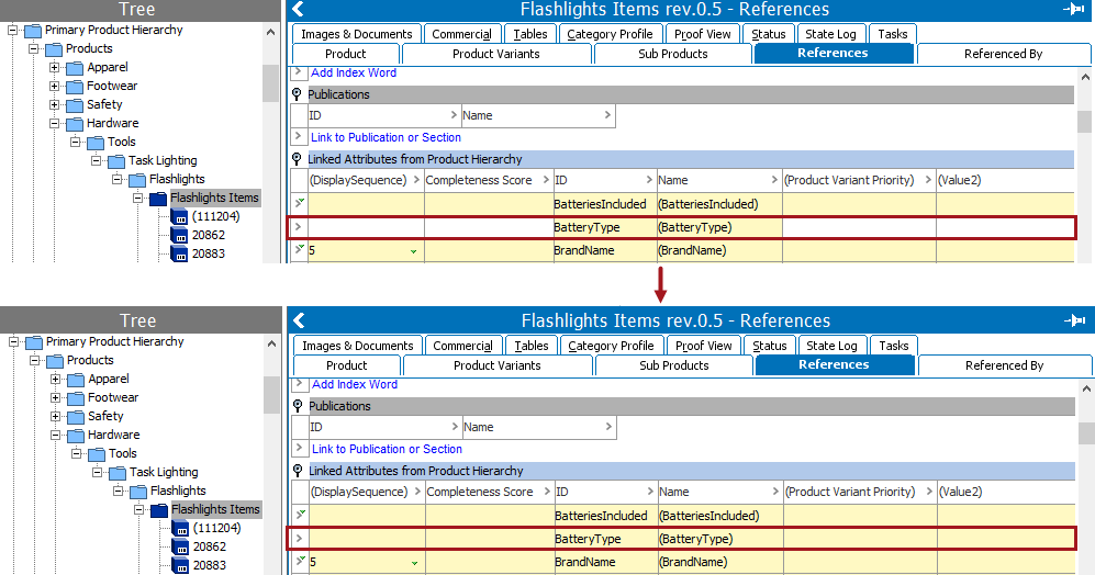 The following images show before and after the 'BatteryType' Remove Attribute Link bulk update is run.