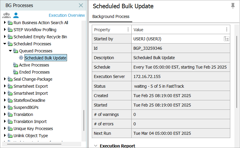 On the left side of the image above, under the Scheduled Processes node, a bulk update that is scheduled to run at a later time is displayed under the 'Queued processes' node.