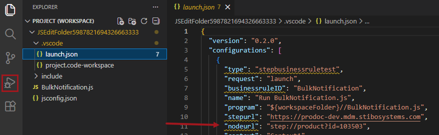 To test and validate the JavaScript in VS Code against a different node than the one selected on the 'Configure External Editor' dialog in the workbench, open the .vscode folder and change the node by editing the launch.json file in and updating the value for the nodeurl element.