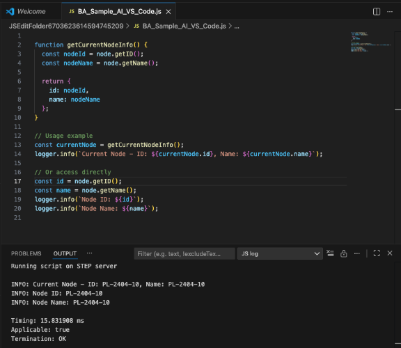 In the desired editing program, a temporary JavaScript file is generated and opened. VS Code is shown in the screenshots below.