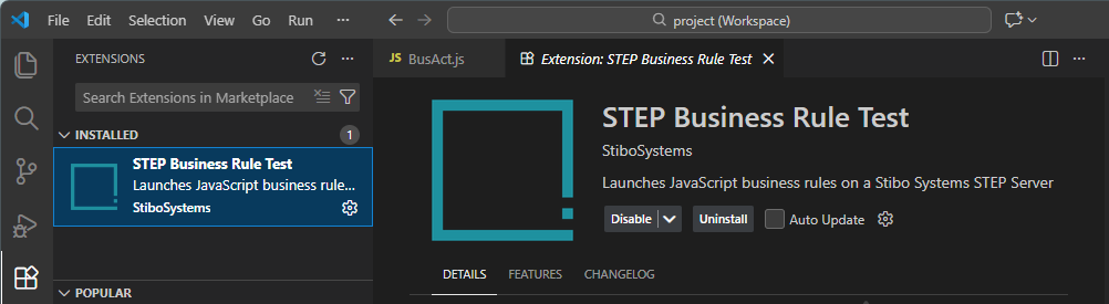 As described in Prerequisites section above, the latest version of the VS Code ‘STEP Business Rule Test’ must be installed. When properly installed, the plugin is listed in the plugins section of VS Code.