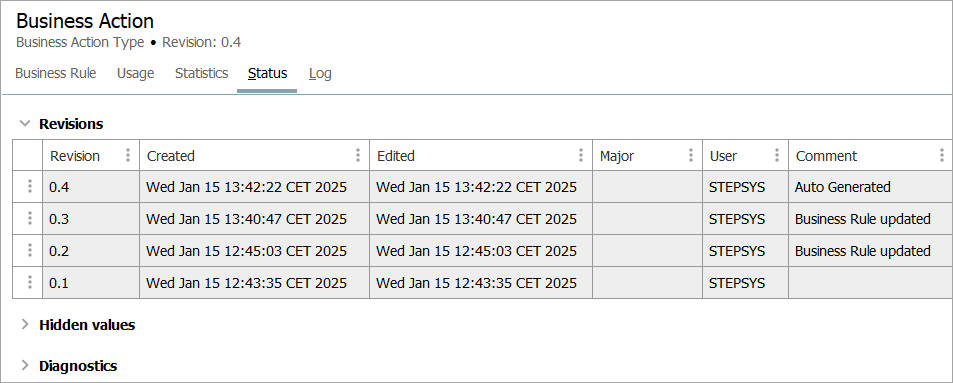 The Status tab provides an overview of the revisions of the business rule, including the user who changed the object and when the change occurred. Previous versions of business rules can be viewed as read-only by clicking the eye icon for the rule.