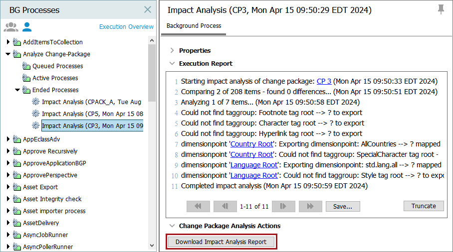 The impact analysis runs as a background process, which is then accessible on the BG Processes tab under Analyze Change-Package. A link to the background process is also provided on the change package object.