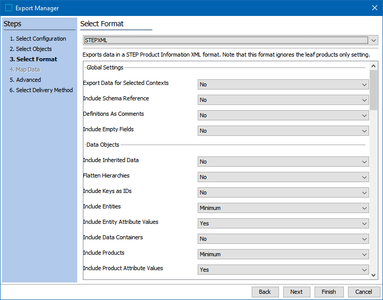 STEPXML can be exported from a STEP system via the Export Manager using either the 'STEPXML' or the 'Advanced STEPXML' format. Both options produce the same format but differ in how you configure the export, i.e., how you decide what data should be included in the exported file. The Advanced STEPXML format makes use of an XML 'output template' sometimes also referred to as a 'recorder file' while the STEPXML format allows for the export to be configured via a UI with a large number of drop-down menus with the selections that allow for behind-the-scenes mapping to an output template. The Advanced STEPXML option is generally harder to work with but offers greater flexibility in configuring the export.