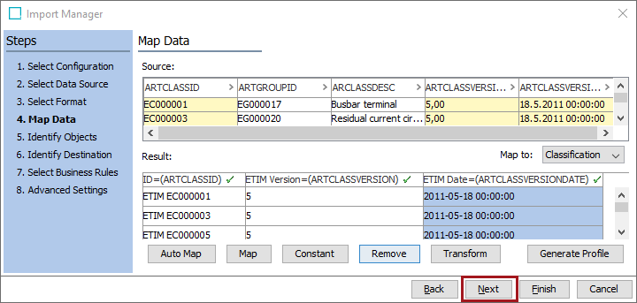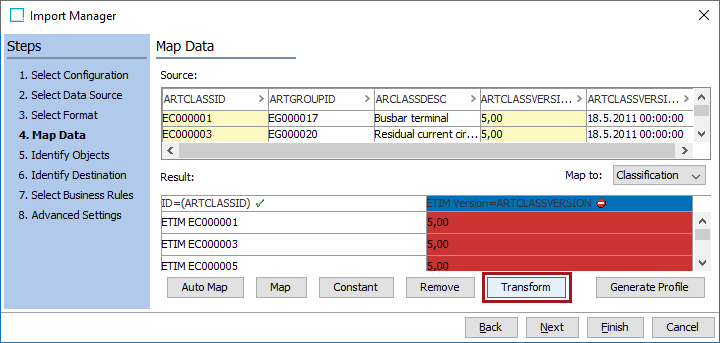 - The ETIM Date attribute has a validation type of 'ISO Date and Time' format, it does not match the format in the ETIM file, so it displays as an error in the Result table. Select the ETIM Date=ARTCLASSVERSIONDATE column and click the Transform button.
