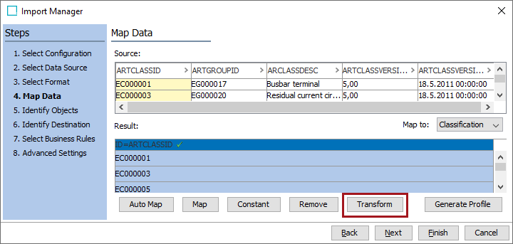 - In the Result table, select the ID=ARTCLASSID column and click the Transform button.