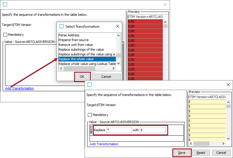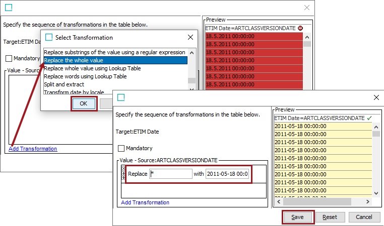 - In the Transformation dialog, click the Add Transformation link, select the Replace the whole value option, replace * with 2011-05-18 00:00:00, and click the Save button. This date is used since the date is the same for all ETIM Classifications.