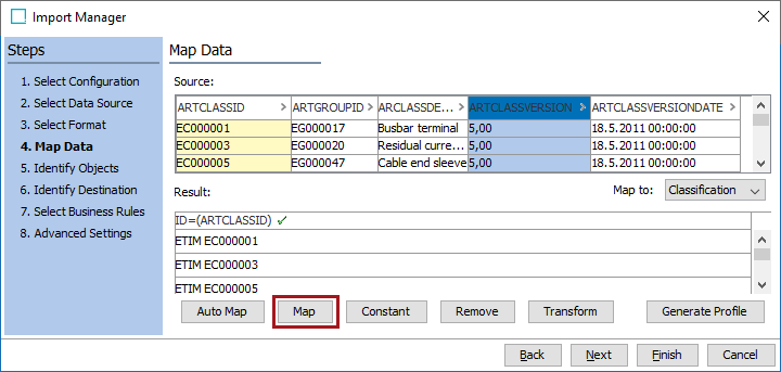 - In the Source table, select the ARTCLASSID column and click the Map button below the Result table.