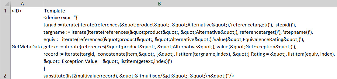 Important: If the pasted text includes an extra set of double quotes surrounding the entire value template, they must be removed for successful import. For example, with this pasted text, the first and last characters must be removed: "<derive expr="FirstRevisionCreateDate()"/>"