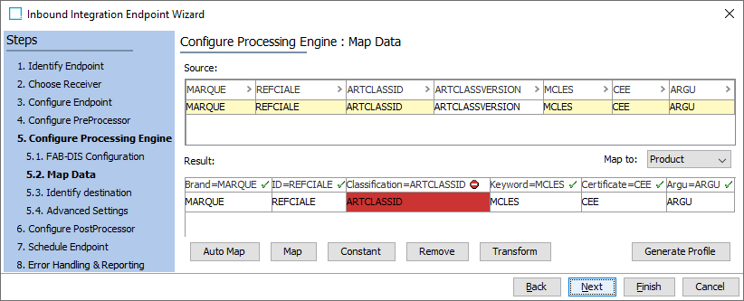 Note: Sample data is not displayed while mapping a FAB-DIS file. This causes an error to display on the ARTCLASSID column in the Results area of Map Data (shown above as the red cell). This error can be ignored without any negative impact provided the mapping and transformation are created correctly. For details, refer to the FAB-DIS Import Example topic.
