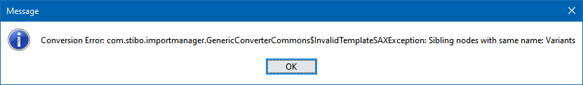The source file includes redundant elements that should be removed to create a valid template. When duplicates exist, clicking the Sample reload button displays a message about sibling nodes with the same name: