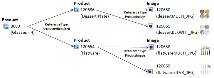 In the following example, the data set contains a product which has multiple references of type AccessoryRequired, to accessory products. Each accessory product has multiple references of type ProductImage, to assets.