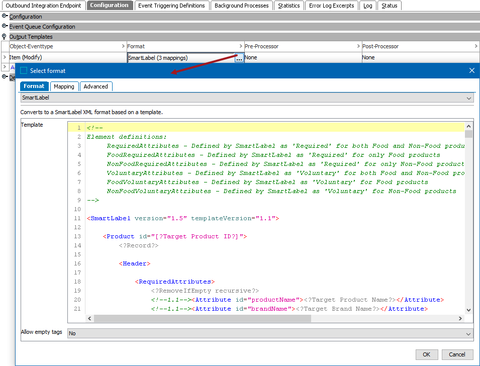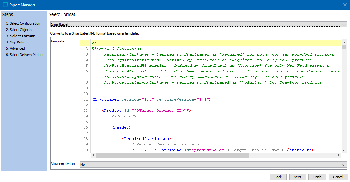 - Template - displays the standard template for export each time a new export is created. The default template includes both food and non-food attributes, and should be modified to exclude attributes not required in your export. The modified template is saved with the export configuration or OIEP output template. For details on modifying the template to suit your data, refer to the Configuring the SmartLabel Template topic.