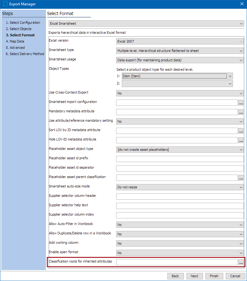 The parameter 'Classification roots for inherited attributes' found on the 'Select Format' step of the Export Manager wizard, allows system administrators to configure one or more Product Classification Links Types when configuring a Smartsheet. When setting up a Smartsheet export, it is essential to ensure that the attributes linked to the classification are valid for exported object types. In case if the attributes with valid object types are not linked, the attributes will not export in the Smartsheet.