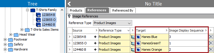 For example, viewing the References tab on the selected products shows the 'Image Display Sequence' metadata attribute on the 'Product Images' reference type.