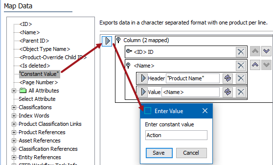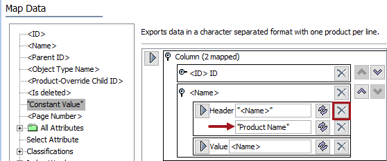 Mapping a constant value allows you to replace the default data with your own text. For example, use a constant value to change a header from the default of <Name> to 'Product Name', or to add static text to the value.