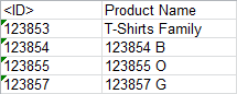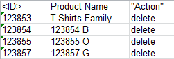 The exported file includes ID, product name and an action column with constant value “delete”.