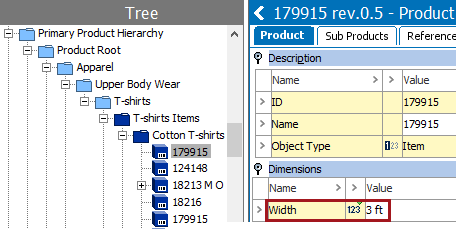 For example, for the Width attribute on a product, the value '3' is associated with the unit 'ft.'