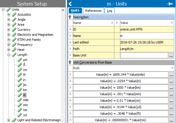Each of the units is associated with the same base unit of m (meters) and include a conversion factor. For example, feet are multiplied by .3048 to get meters. The base unit of meters includes all required conversion rules. For more information on base units, refer to the Units topic in the System Setup documentation.
