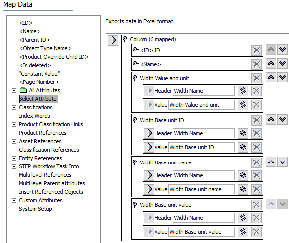 In addition to the ID and name of the product, the values identified above are mapped using the Select Attribute data source and the specified aspect.