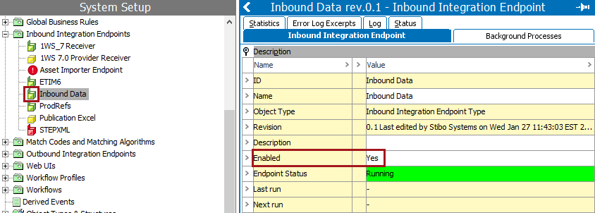 The tree navigator icon now shows enabled. On the Inbound Integration Endpoint tab, the Description section includes the 'Enabled' parameter, which now displays 'Yes.'