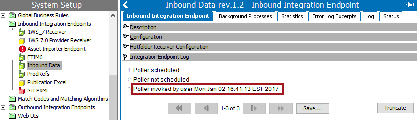 - When invoked on schedule and manually, files or messages available in the location identified by the IIEP receiver configuration are processed. The Integration Endpoint Log section displays the time the endpoint was invoked. For scheduled IIEPs, the log includes a link to the BGP that was started. For more information, refer to the Maintaining an Inbound Integration Endpoint topic.
