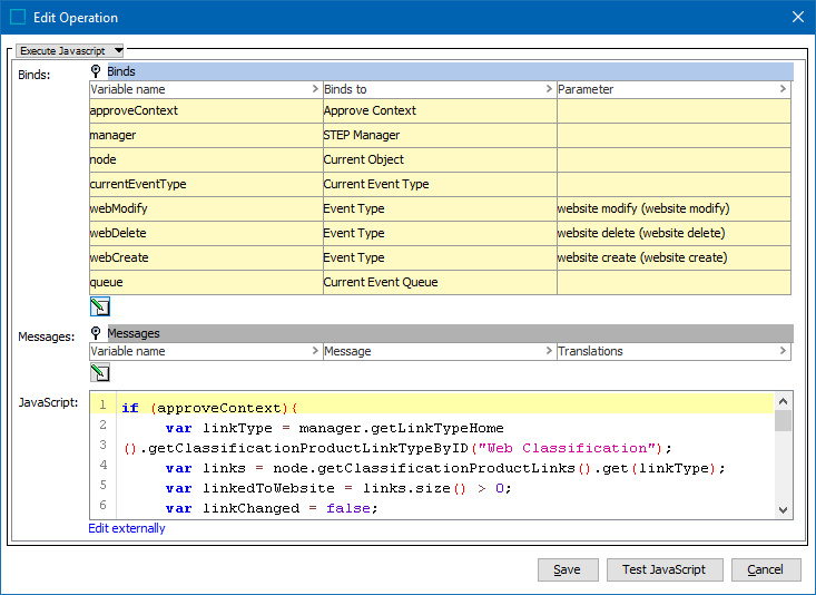 Create a new business action and make it valid for the appropriate object types. Use the Execute JavaScript operation and add the following binds, including binds for the derived events: