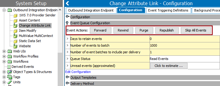 The Forward action requires that unread events exist in the queue. This option is typically used when the unread events in the queue should not be published to downstream systems. For example, consider that you performed a system refresh or data maintenance activity that generated events.