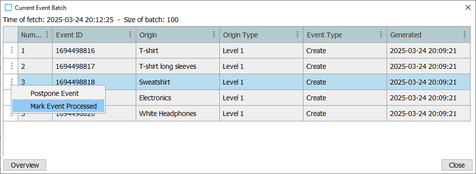 - The Current Event Batch dialog displays the first 100 unread events on the queue. Hover over the Event Type column text for the actual event types being deduplicated if the Event Mode parameter is set to Deduplicate, as discussed in the EP - Event Processor Tab topic.