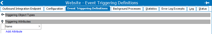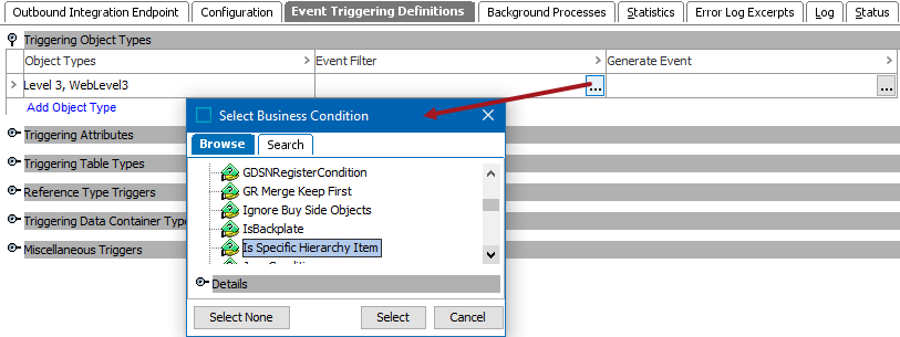 Event triggering definitions define what changes (events) are important and should be monitored by the OIEP or EP. For an OIEP, changes to any element defined on this tab are then formatted based on the output template and ultimately queued for export. For an EP, changes to any element defined on this tab are then handled by the selected core processor. For details about event generation, refer to the Events topic of the System Setup documentation.