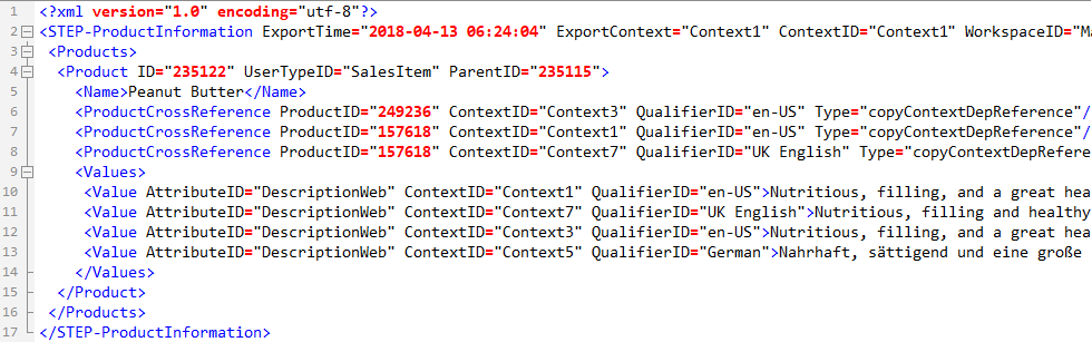 The following shows an XML output of an OIEP cross-context export (exporting data for selected contexts) with the Copy Context Dependent Values and References post-processor enabled: