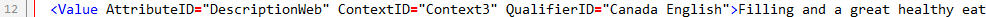 The <ContextID> tag has been added to the export along with the <QualifierID> tag, and each value—including inherited values—is explicitly exported. This means that the 'English Canada' (Context3) values are included in the export, even though it inherits from the master context. If the value is overwritten in the English Canada context, as shown below, the <QualifierID> changes to the ID of the 'Canada English' language dimension point.