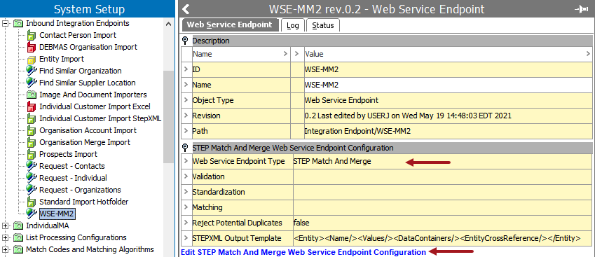 On the Web Service Endpoint object, open the STEP Match and Merge Web Service Endpoint Configuration section and verify the 'Web Service Endpoint Type' is set to 'STEP Match and Merge '. The type cannot be changed, if necessary, create a new web service endpoint. For other types of endpoints, refer to the configuration options defined in the Web Service Endpoints topic.