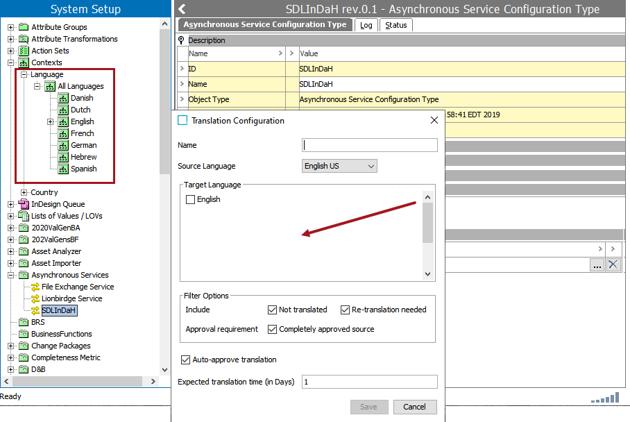 - In System Setup, select the asynchronous service configuration (named 'SDL Translations' in the image below), and on the first tab open the Translation Configuration flipper.