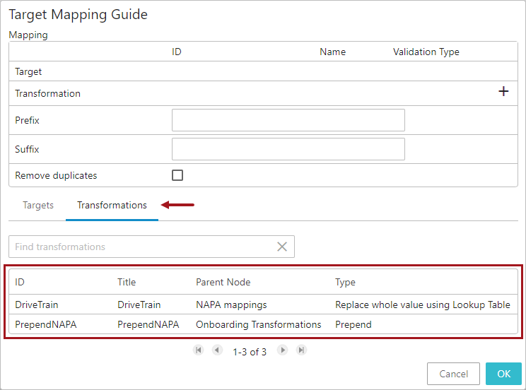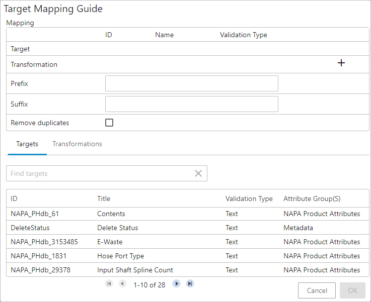 Once all the parameters within the Target Mapping Guide window are populated, click the OK button at the bottom right of the window to close the window. All the values populated within the Target Mapping Guide window will be reflected accordingly within the five parameters (Target, Transformation, Prefix, Suffix, and 'Remove duplicates') available under the Target Definition field.