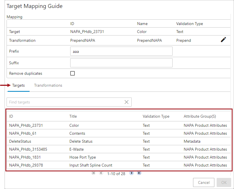 To configure the five parameters available under the Target Definition field (Target, Transformation, Prefix, Suffix, and 'Remove duplicates'), users must access the Target Mapping Guide window. Click on the edit icon (
