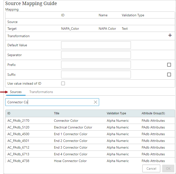 Source: The Source row displays the attribute belonging to the Source object from which the value is retrieved. To configure a source attribute to this field, users should select an attribute from the table on the 'Sources' tab found in the lower half of the window (as shown below). A search bar above the table enables typeahead searching, which allows users to type in the first few characters of the desired source attribute name, and then select the desired source attribute from the results. Further, users can take the help of the typeahead field to type in the few characters of the attribute name to find their appropriate source attribute. It is mandatory to have an attribute defined in the Source parameter.